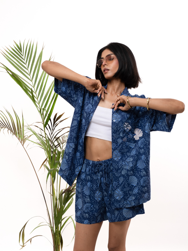 Step into the summer with our breezy rayon printed two-piece set. Perfect for vacations and casual outings, this co-ord set features a soft, shell embroidered p…