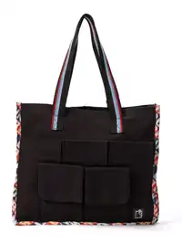 Step out in style with this quirky yet functional tote bag! With bold colour and rightly placed graphics, this bag merges utility with a fun, urban aesthetic. The multi-striped woven handles add a colourful touch and ensure comfortable carrying. The front pockets add both design detailing and efficient organising for you to access all your necessities with immense ease.