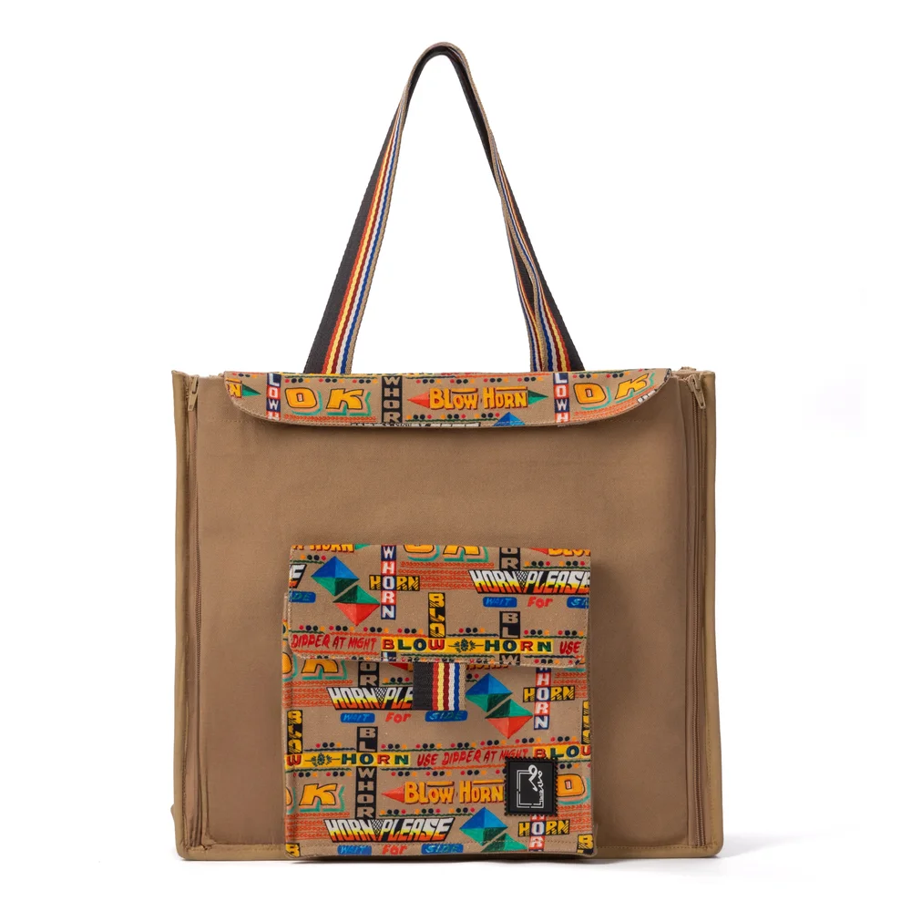 Make a bold statement with this striking, functional and uniquely designed tote bag! Adorned with vibrant typography-inspired prints/eye-catching colours, this bag is a lively homage to Indian truck art. Its spacious design, coupled with practical compartments, ensures that you can carry your essentials in style. It’s expandable zipper allows you to carry all necessities or a daycation or an overnight trip.