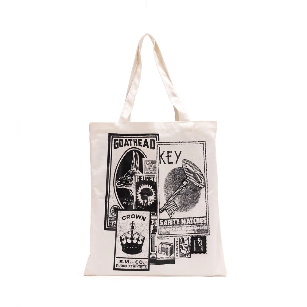 Inspired by India’s old matchstick box artworks, this bag brings together vintage icons — keys, crowns, goats, stamps, labels — reprinted in a bold monochrome collage. Each graphic is pulled from real matchbox designs, giving the tote a nostalgic, street-local character.