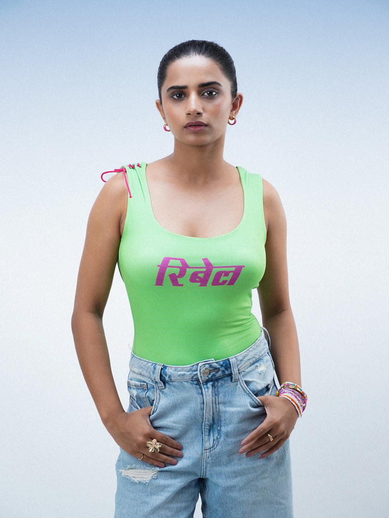 Experience the perfect blend of style and comfort with our Rebel bodysuit. Crafted from stretch polyester-lycra, this green sleeveless bodysuit features rivet a…