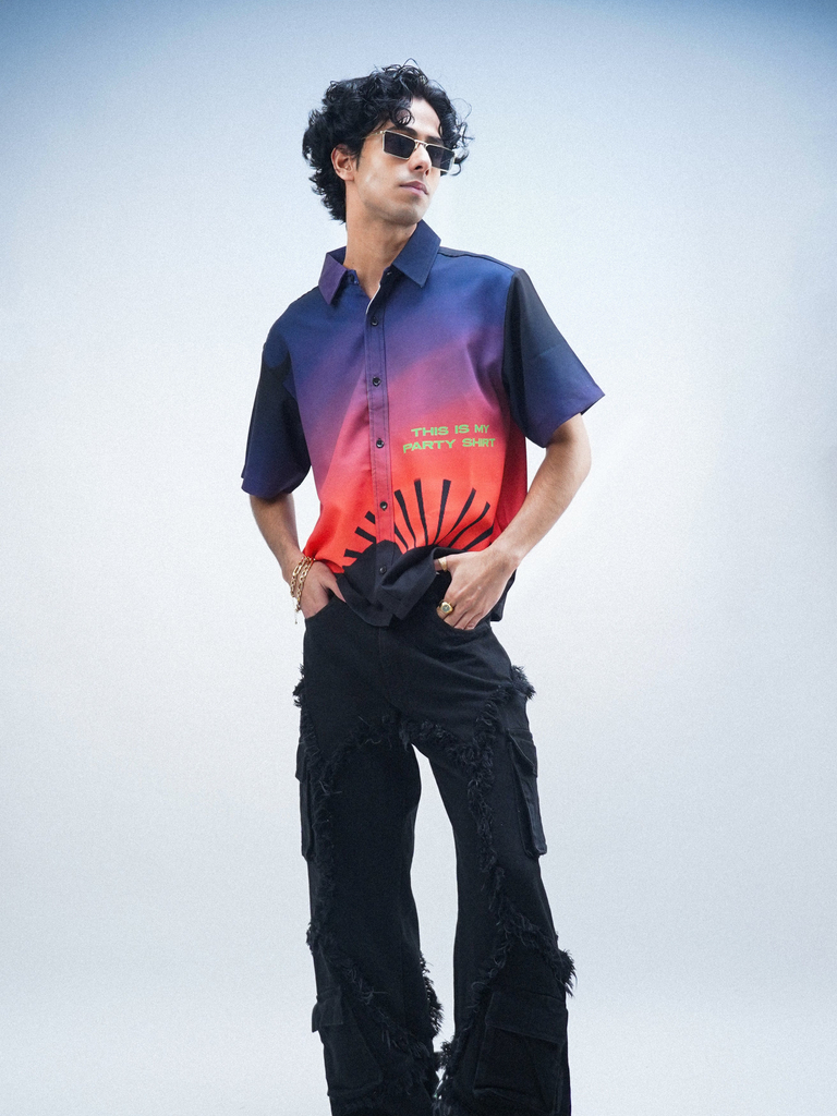 Celebrate in style with this oversized banana crepe party shirt, featuring a vibrant ombré sublimation print and the text detail “This is my party shirt.” Perfe…