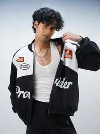 Discover the 19O4 Black & White Jacket, a statement piece with embroidered patches and bold screen prints. This relaxed fit jacket offers a perfect blend of comfort and style. Ideal for casual outings, it features a zip-front closure, making it easy to wear. Crafted from a blend of 20% cotton and 80% polyester, it ensures a soft and breathable fit. Pair it with jeans or chinos for a chic, everyday look.