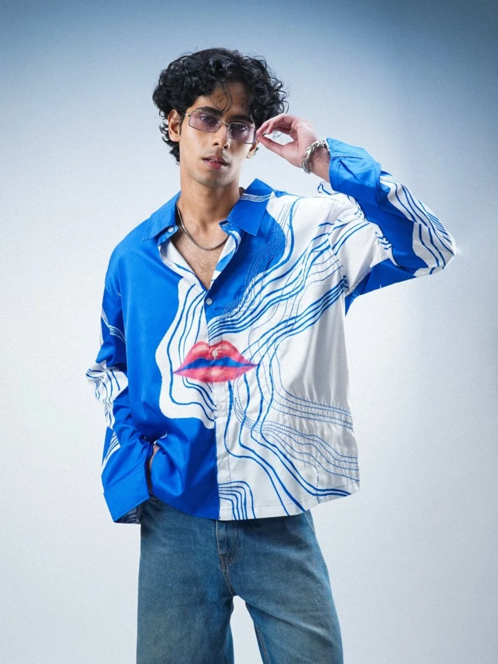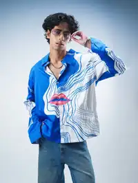Elevate your wardrobe with the Blue Lips Shirt, crafted from soft cotton poplin. This piece features a vibrant digital lips print with machine-embroidered accents, offering a bold, standout look. The slightly oversized fit with button closure ensures comfort and style for any occasion. Perfect for casual outings or as a chic addition to your everyday ensemble.