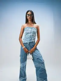 Elevate your everyday style with this classic blue denim jeans for women. Crafted from 100% cotton denim, these jeans offer a structured, wide-leg fit with high-rise design, multiple pocket detailing, and screen print artwork. Perfect for casual outings or as a staple in your wardrobe, they provide comfort and durability. Pair them with a casual top or a stylish blouse for an effortlessly chic look.