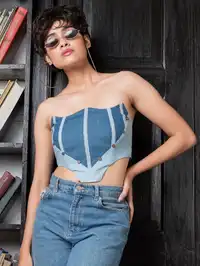 Step into the heart of modern fashion with this edgy denim crop top. The structured patchwork design with vertical panels and button details makes it a perfect corset-inspired piece for the fashion-forward woman. The strapless fit and pointed hem add a bold touch, while the back tie-up closure offers a customizable fit. Ideal for casual outings or festival events, this top is a must-have for your wardrobe.