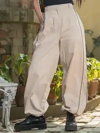 Step into a world of comfort and style with our high-waisted camel pants. Crafted from soft cotton blend, these jogger-style pants feature a front button and zip closure, black piping, and drawstring hems for a versatile look. Ideal for casual outings or festival wear, these pants are designed to flatter your figure and keep you comfortable all day long. Pair with a simple top or a stylish blouse for an effortlessly chic look.
