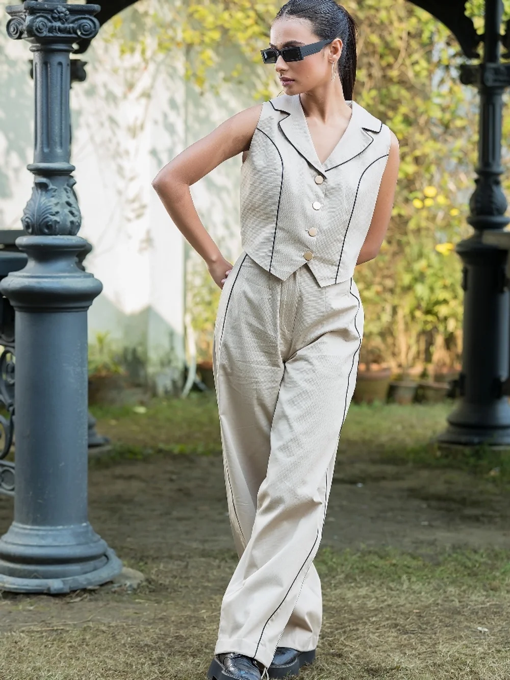 Step into style with this chic beige cotton set designed for women. The textured waistcoat with a lapel collar and striking black piping pairs perfectly with high-waisted beige textured pants. The front button and zip closure, along with drawstring hems, offer a versatile jogger-style twist. Ideal for casual outings or festive gatherings, this set promises comfort and elegance in every wear.