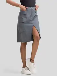 Step up your casual wardrobe with this grey denim cargo skirt, perfect for a range of occasions from casual outings to festivals. Made from durable ash denim, this high-waisted skirt features pocket flaps, a front fly zip, and a distressed hem. Its medium stretch ensures a comfortable fit, ideal for any body type. Pair it with a simple tee for a laid-back look or dress it up with a blouse for a chic office style.