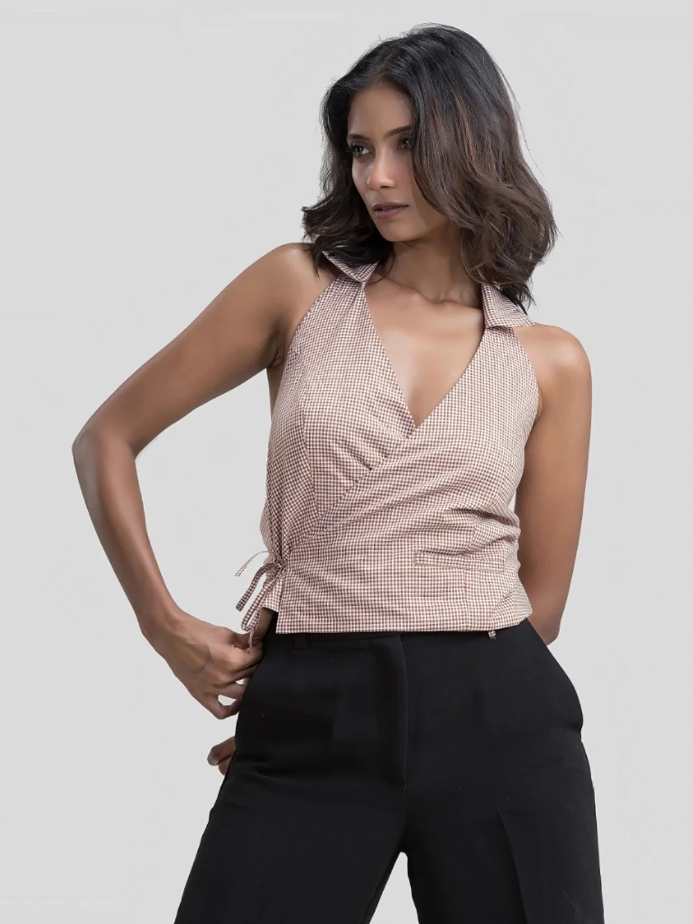 Elevate your wardrobe with this elegant brown halter neck wrap waistcoat. Crafted from soft cotton, this stylish waistcoat features a unique side tie-up closure that adds a chic touch. Perfect for casual outings or as a sophisticated layer, its fitted design flatters various body types. Pair it with your favorite jeans or skirts for a trendy look that's both comfortable and fashionable.