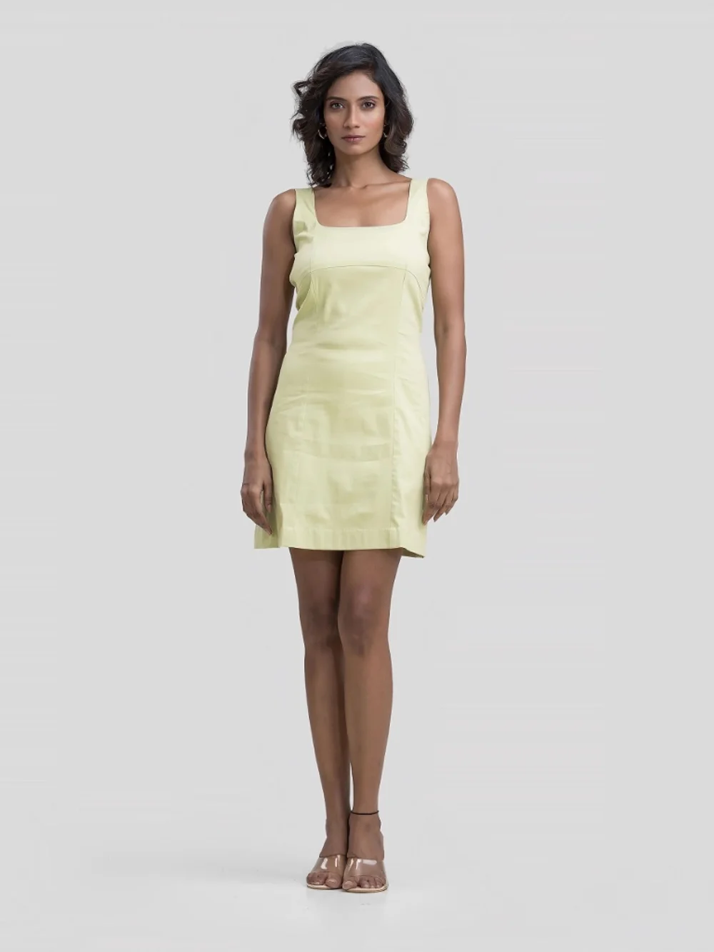 Embrace the summer with this soft green cotton dress from Solete Lifestyle. Perfect for casual outings, this fitted dress features a beautifully shaped cut at the front chest and a stretchable fit that feels like a glove. The sleeveless design adds a touch of elegance while the elastic at the back ensures a comfortable fit. Ideal for those who love to stay cool in the heat.