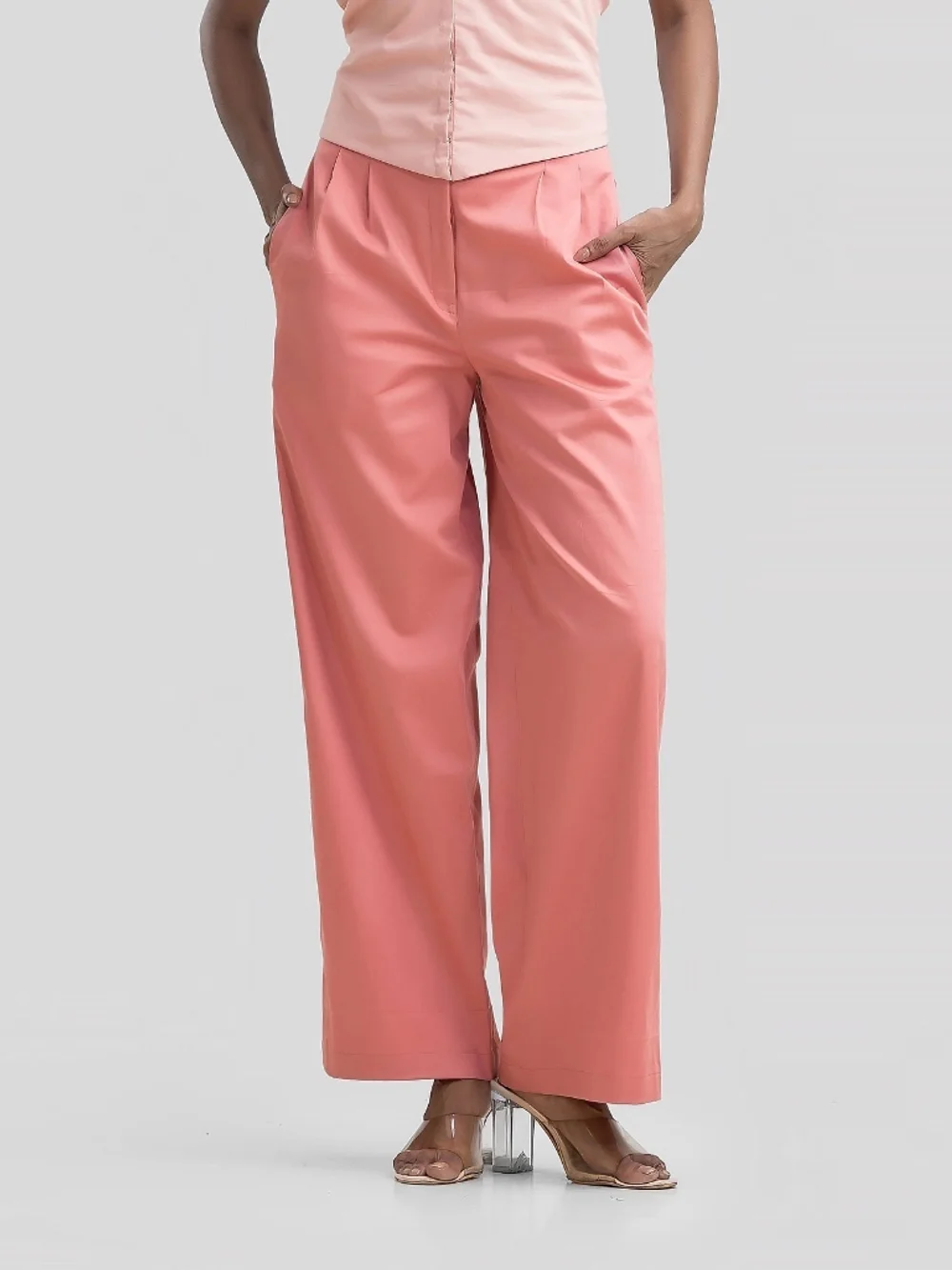 Step into summer style with our highwaisted straight pants featuring front pleats, side pockets, and a sleek front fly zip with a metal hook closure. Crafted from soft, breathable cotton, these pants offer medium stretch for a comfortable fit. Ideal for casual outings or a day at the office, they're perfect for the modern woman who values both comfort and style.