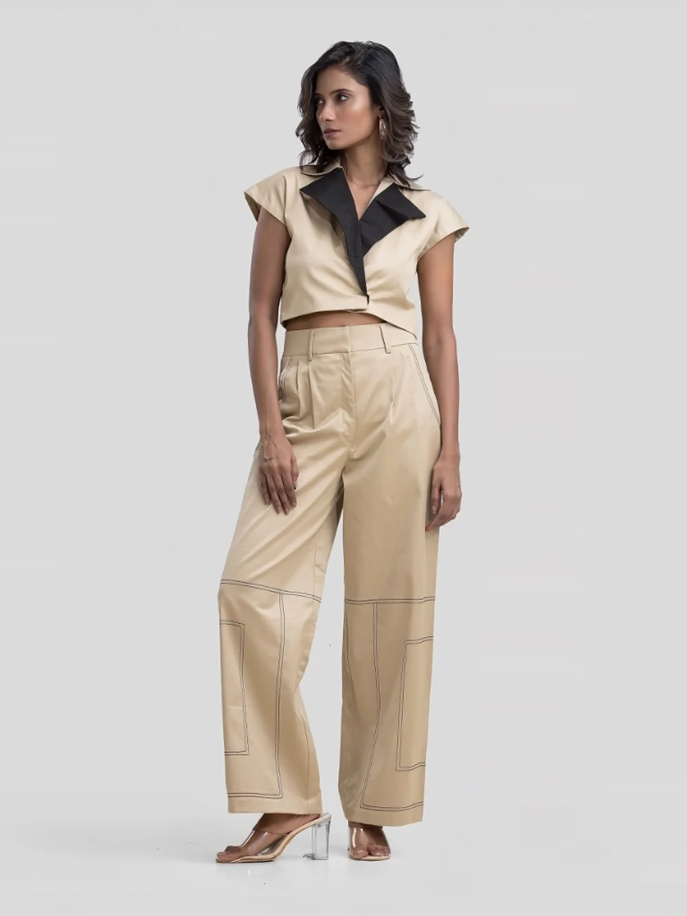 Experience the perfect blend of comfort and style with this elegant cotton tan set designed for women. The structured top features a contrasting collar, lower overlapping lapel, and front closure, while the high-waisted wide-leg pants provide a flattering fit. Ideal for both office wear and casual events, this versatile ensemble is made from breathable cotton fabric that ensures all-day comfort. Pair it with your favorite accessories for a chic look that's perfect for any occasion.