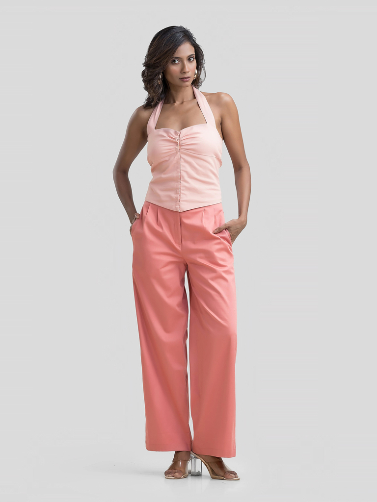 Elevate your summer wardrobe with this chic pink cotton crop top. Designed with a halter neck and sweetheart neckline, it features a corset style with a front g…
