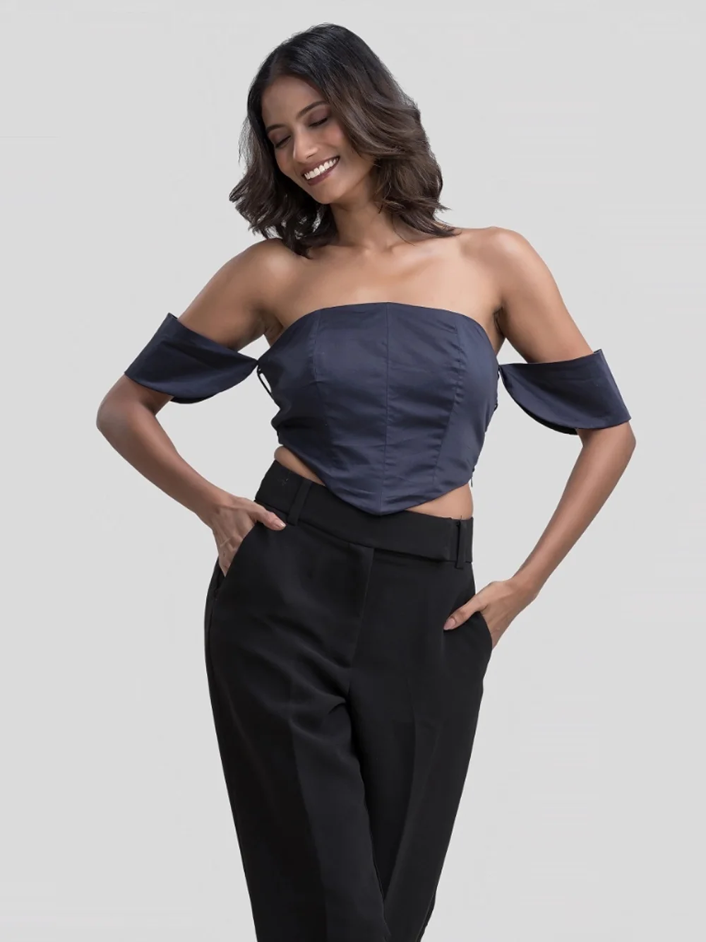 Dive into the world of Indo-western fashion with this Prussian Corset Top. Crafted from soft cotton fabric, it features a stunning v-neck and strapless design that flatters the figure beautifully. Perfect for casual outings or a touch of elegance to your everyday look, this top is a must-have for summer. Pair it with high-waisted trousers for a chic ensemble.