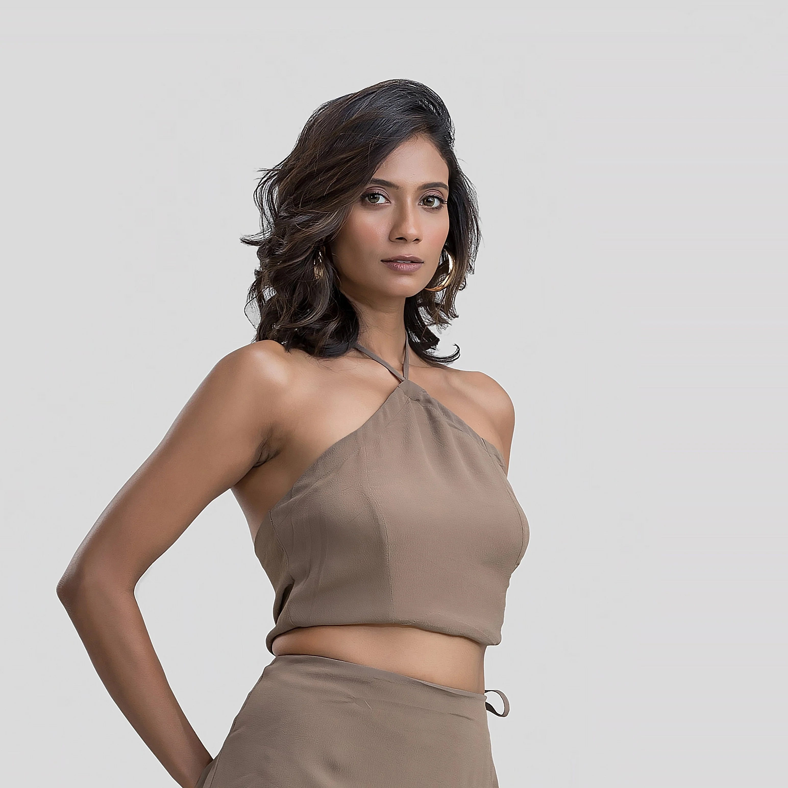 Step into summer with this stylish viscose cotton halter neck crop top. Perfect for casual outings or smart-casual settings, this top features an adjustable dra…