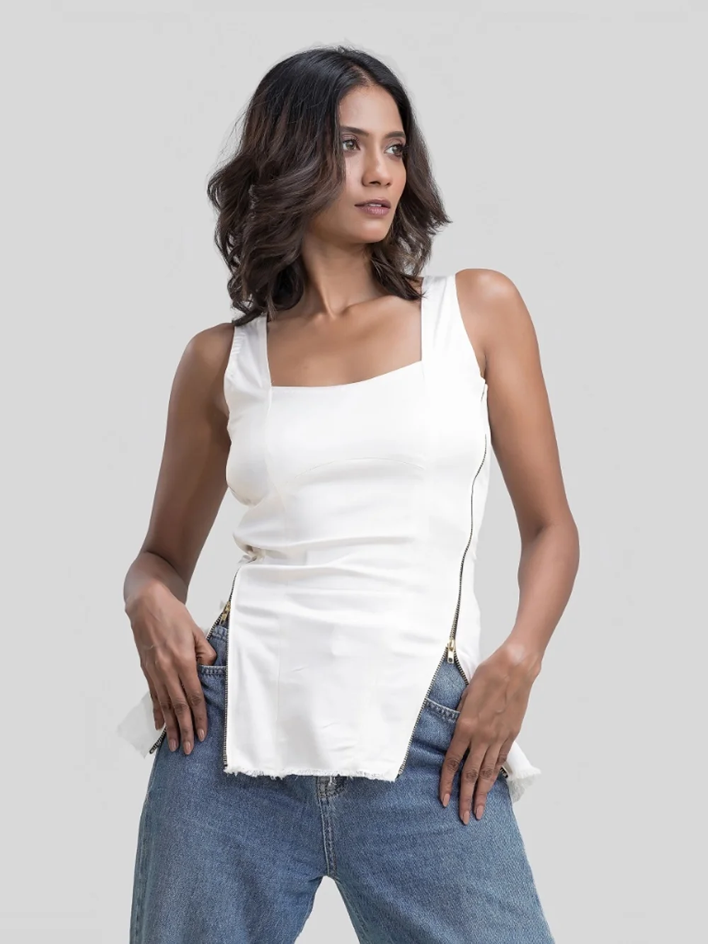 Experience the perfect blend of style and comfort with our distressed satin lycra crop top. Ideal for casual outings or smart-casual occasions, this top features a square neckline and zip-down detail, giving it an edgy, modern look. The fabric's high stretch ensures a perfect fit, while the medium length top complements various styles effortlessly. Pair it with high-waisted jeans or a mini skirt for an effortlessly chic look.