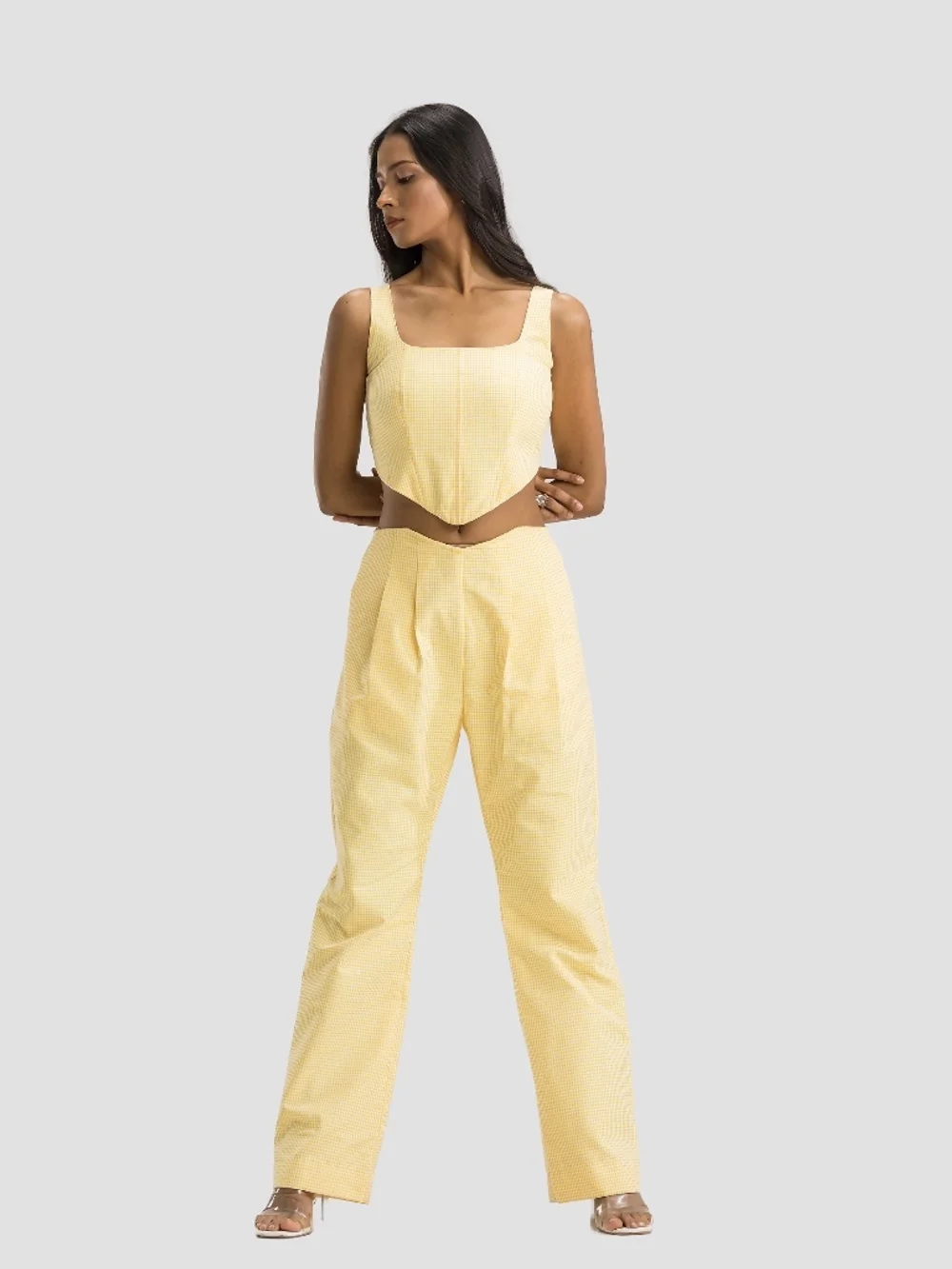 Discover the Yellow Gingham Reversible Set, a versatile and stylish ensemble perfect for any occasion. The reversible set features a chic corset top in gingham with a plain white cotton side, ideal for day or night. Pair it with the high-waisted straight pants for a flattering fit. Made from soft cotton, this ensemble is perfect for casual outings or special events. Style with minimal jewelry for a casual look or elegant accessories for a party night.