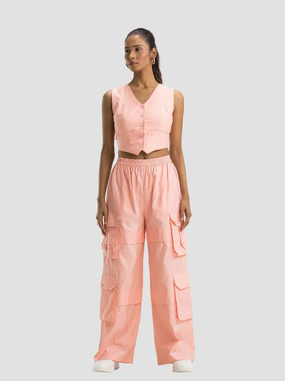 Step into effortless chic with the Blossom Set, a delightful pink cotton co-ord that's perfect for the warm Indian summer. The sleeveless V-neck top is adorned with tinted buttons and welt pockets, while the high-waisted straight cargo trousers feature an elasticated waistband and six pockets for added practicality. Ideal for casual outings or a relaxed day, this set combines comfort with style, making it a must-have for any wardrobe.