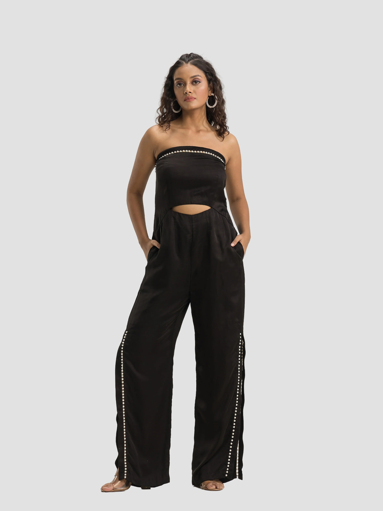 Elevate your special occasion look with the Pearl Tube Jumpsuit. Crafted from luxurious satin, this jumpsuit features a fitted silhouette and pearl detailing th…