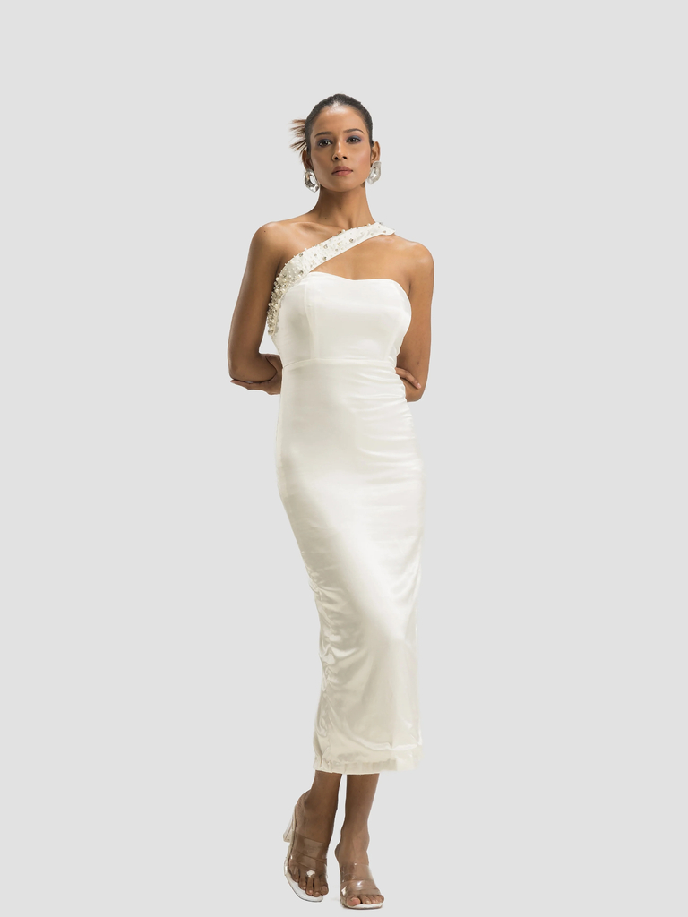 One Shoulder Embellished Corset Midi Dress