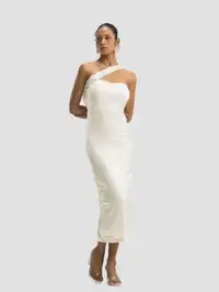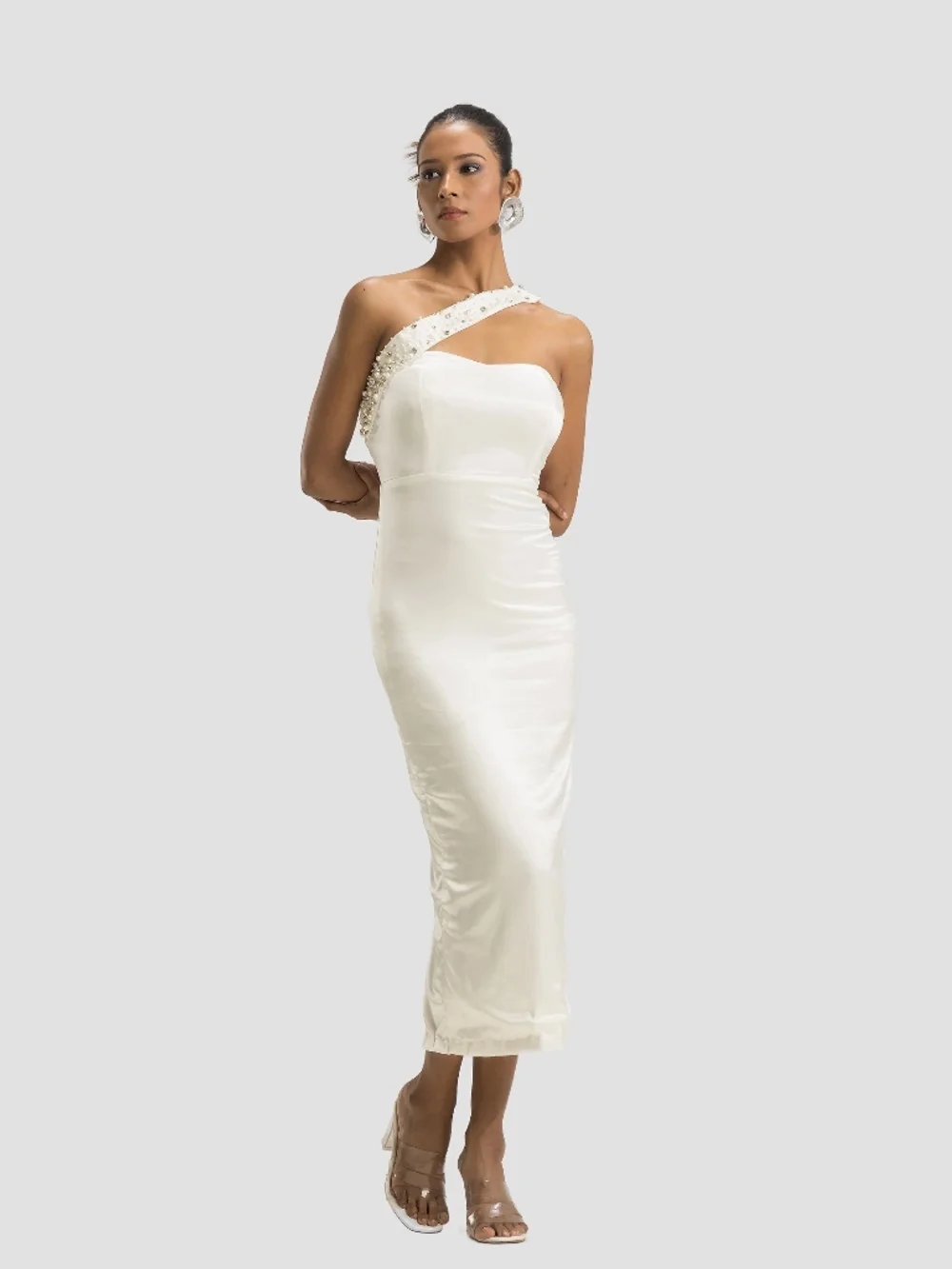 Elevate your party wardrobe with this One Shoulder Embellished Corset Midi Dress for women. Made from luxurious lycra satin, this dress features a fitted corset-style design with exquisite pearl and stone embellishment on the neck strap. Perfect for special occasions and parties, its high stretch fabric ensures a comfortable fit that flatters all body types. Pair it with statement jewelry and ankle boots for an unforgettable look.