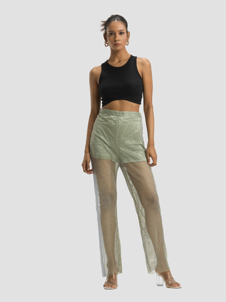 Step into the summer with the Olive Sparkle Pants, a perfect blend of style and comfort. Made from lightweight mesh fabric, these pants offer a sleek, fitted lo…