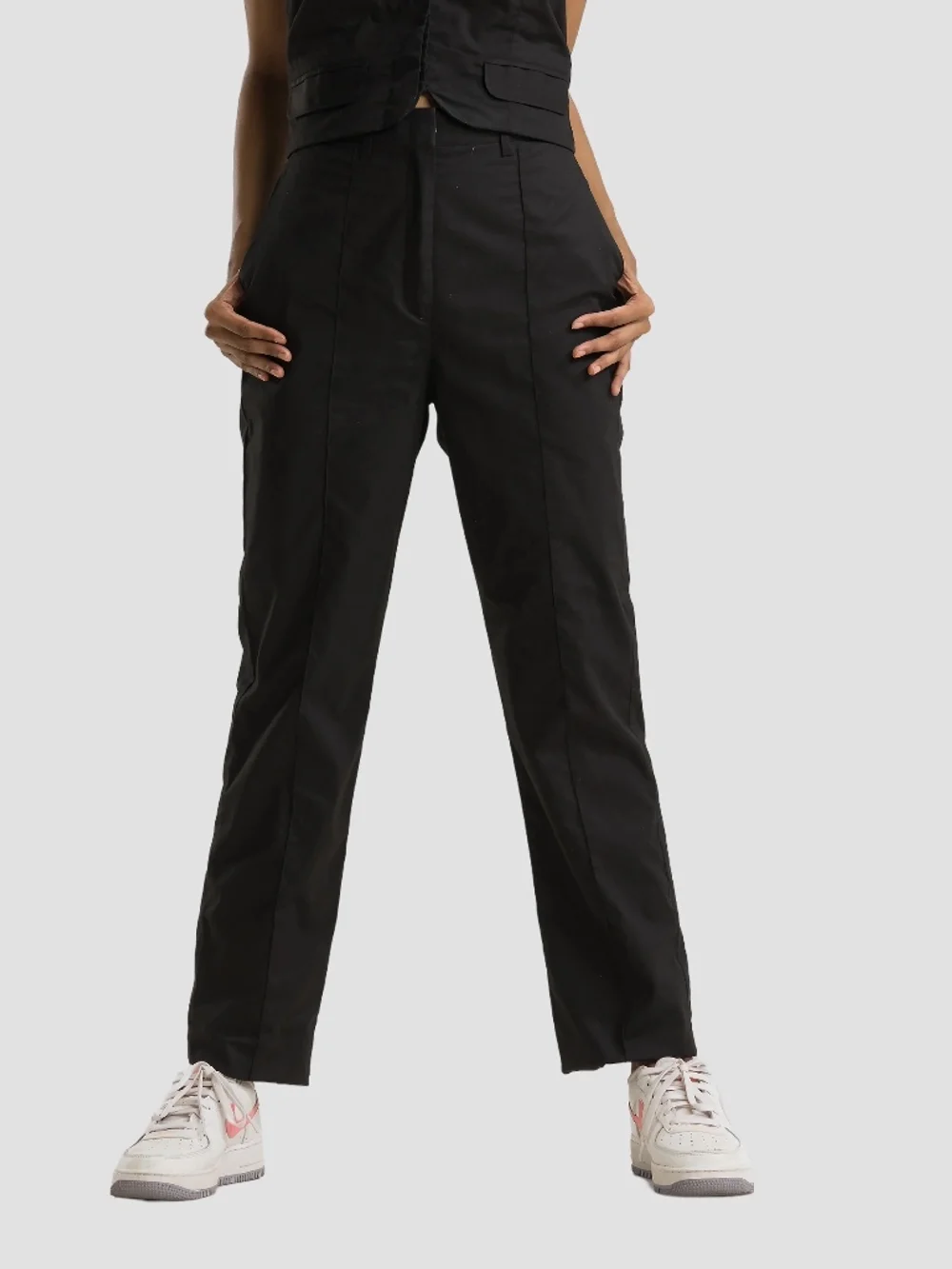 Elevate your everyday chic with these highwaisted straight cotton pants for women. Made from soft, breathable cotton, these trousers feature a sleek straight-leg design with pin tuck detailing and turn-up hems. Perfect for casual outings or smart-casual events, they come in a versatile black color. Style them with a fitted top or a blouse for a polished look. Easy to maintain, these pants are a must-have for your wardrobe.
