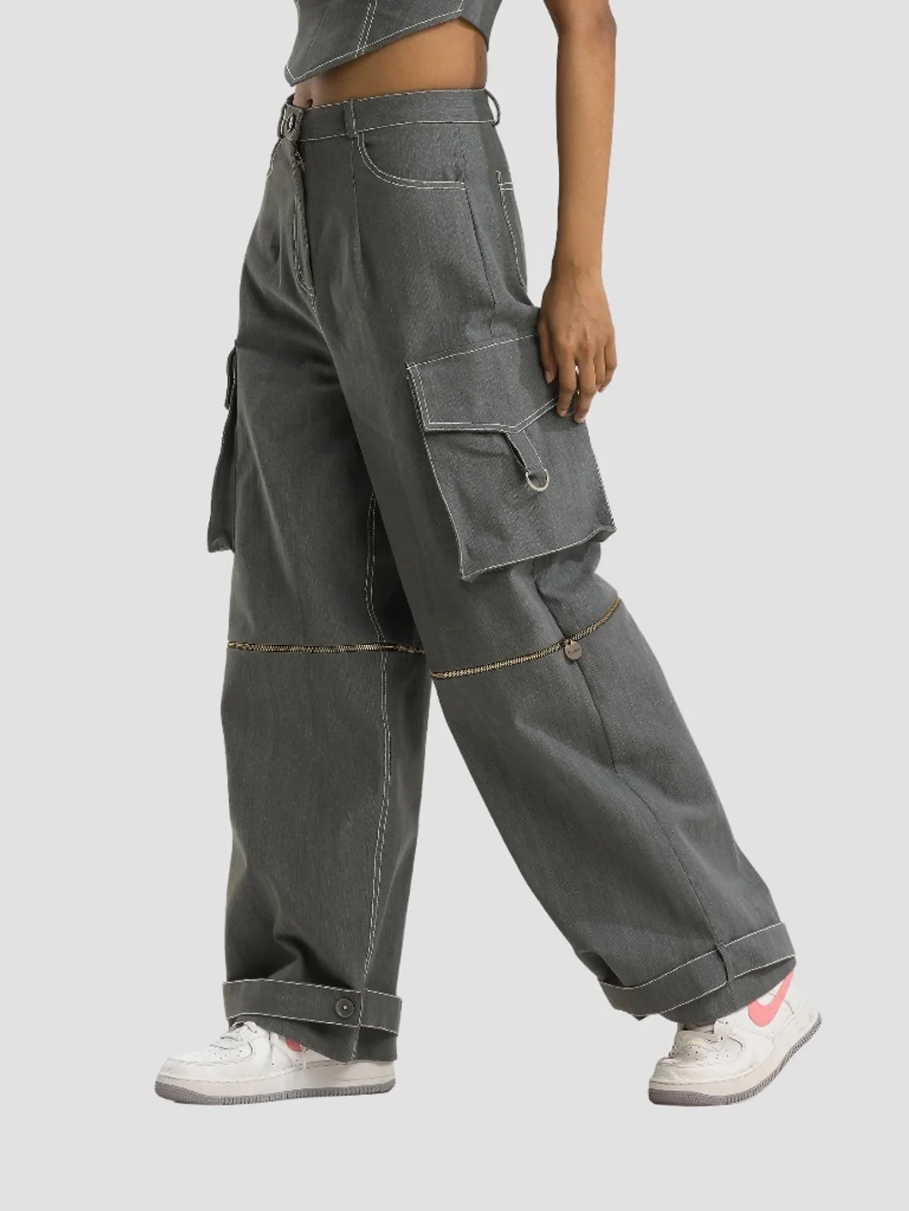 Elevate your casual wardrobe with our Ash Zip Off Cargo Pants. Crafted from premium denim, these pants offer a wide fit that flatters every body type. Perfect for a laid-back day out, these pants feature six pockets, a front fly zip, and adjustable zip-off sections below the knee for added versatility. The medium stretch fabric ensures comfort, while the high waist provides a flattering silhouette. Pair these with a tee for a chic, laid-back look or dress them up with a blouse for a more polished appearance.