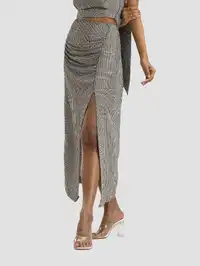 Elevate your wardrobe with this woven draped skirt, perfect for a summer day out or an evening party. Crafted from soft cotton, this midi skirt features a high waist with front gathered draping and a mid-thigh slit. The invisible elastic at the back and side zip fastening offer ease of wear. Ideal for casual outings or a touch of elegance at any event.