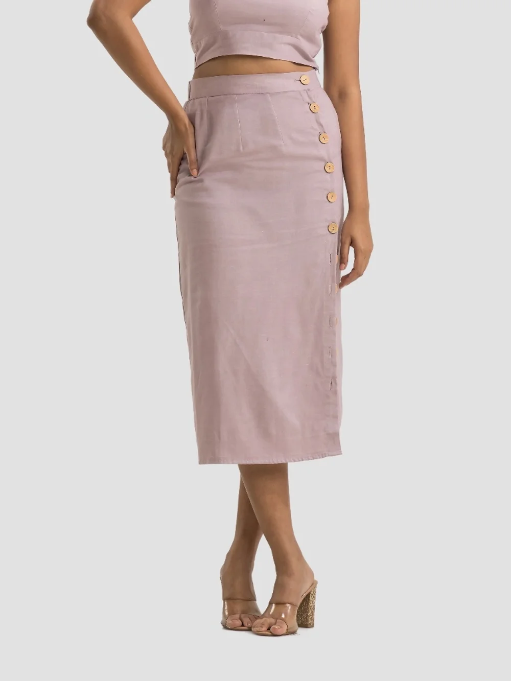 Step into summer with this elegant lavender midi skirt crafted from a luxurious cotton-linen blend. The high-waist fit and long slit adorned with wooden buttons make it perfect for casual outings or a relaxed day out. The blend ensures comfort and breathability, ideal for the Indian summer. Pair it with a crisp top and sandals for an effortlessly chic look.