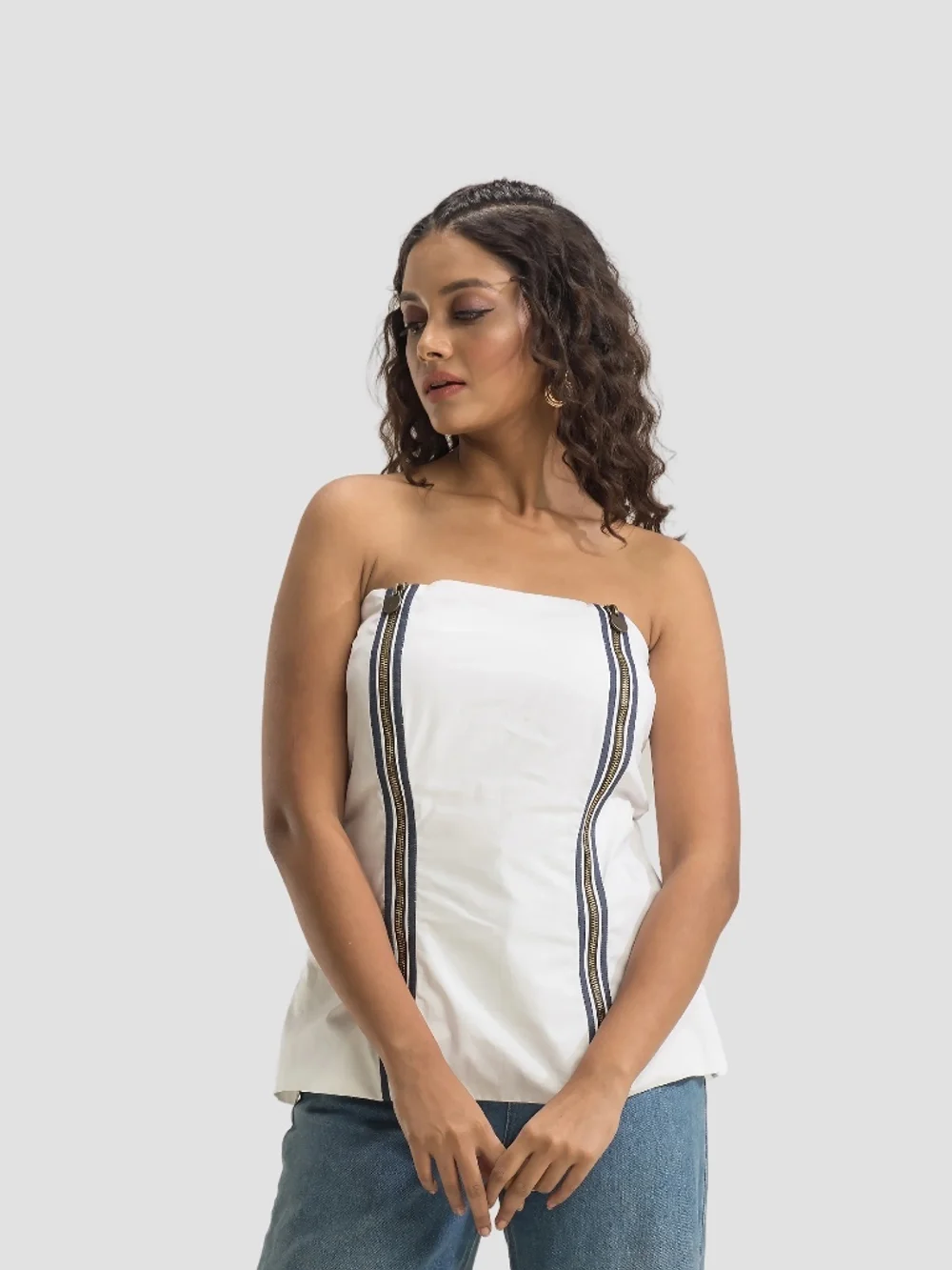 Step into summer with this Zip Me Up Tube Top by Solete. Crafted from a blend of cotton and denim, this sleeveless crop top features a zip-up design with denim borders at the front and a back zip fastening. Perfect for casual outings, this fitted tube top is lightweight and breathable, making it a must-have for your summer wardrobe. Style it with jeans or a skirt for an effortlessly chic look.