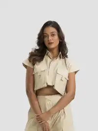Elevate your wardrobe with this boxy fit cargo top for women, perfect for casual outings and everyday style. Crafted from soft cotton, this crop top features two front flap pockets, a wide placket with concealed buttons, and a spread collar for a chic look. Ideal for summer wear, this top flatters various body types and can be styled effortlessly with jeans or skirts. Easy care and available in sizes XS to XL, this top is a must-have for your collection.