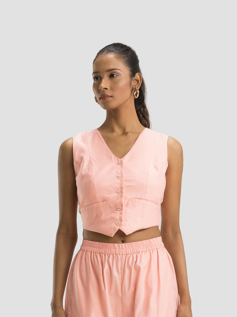 Discover the Blossom Waistcoat, a perfect blend of comfort and style for women. Crafted from soft cotton, this sleeveless V-neck waistcoat features tinted butto…