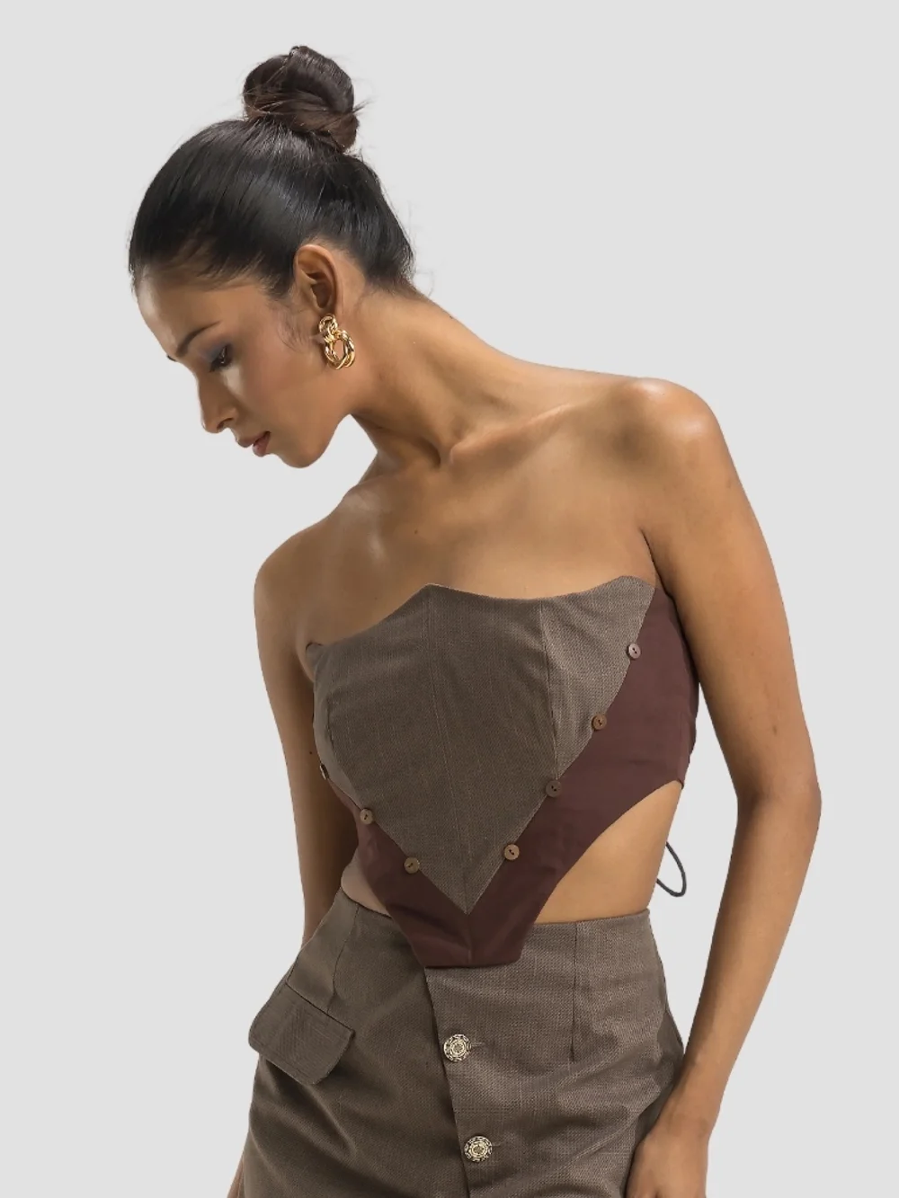 Step into elegance with our Mocha Corset Top, a versatile piece perfect for smart casual and party occasions. Crafted from a blend of fabrics, this top features wooden decorative buttons and a back tie-up fastening. Ideal for those seeking a fitted look, it offers a comfortable yet chic fit. Style it with high-waisted pants or a mini skirt for an effortlessly trendy look.