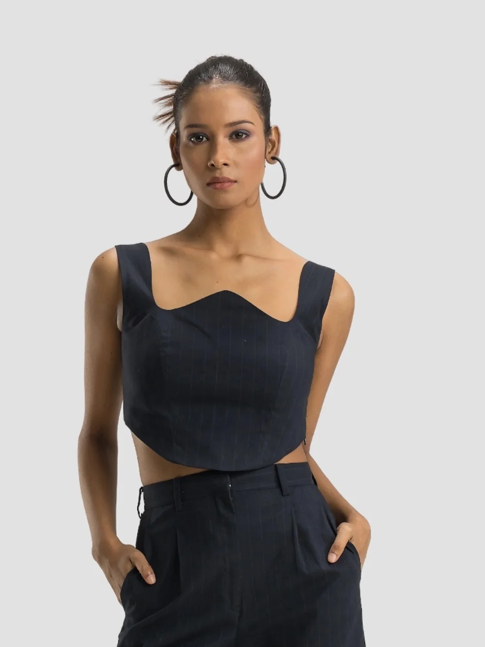 Elevate your wardrobe with this classic navy cotton top. Perfect for a casual day out or a chic party look, its fitted sweetheart neckline and sleeveless design offer a flattering fit. Made from breathable cotton, it's comfortable and easy to style. Pair it with high-waisted jeans for a trendy look or a midi skirt for an elegant ensemble.
