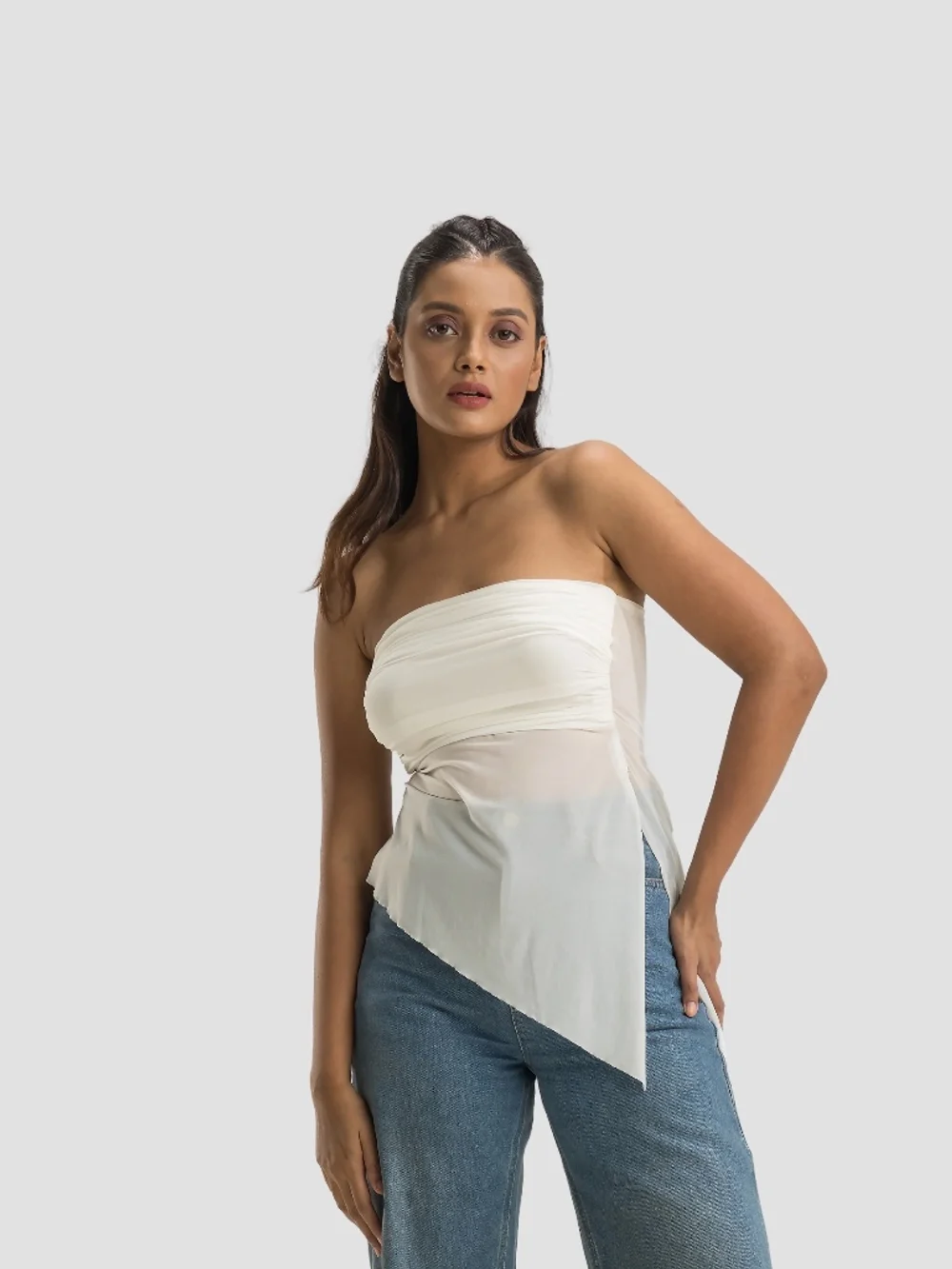 Experience the perfect blend of style and comfort with this Strapless Gathered Asymmetrical Top. Crafted from a mix of lycra and mesh, this top offers high stretchability, making it ideal for all-day wear. The front gathers and asymmetrical hem give it a trendy, modern look, perfect for casual outings or smart-casual events. Pair it with high-waisted trousers for a chic look that’s both fashionable and functional.