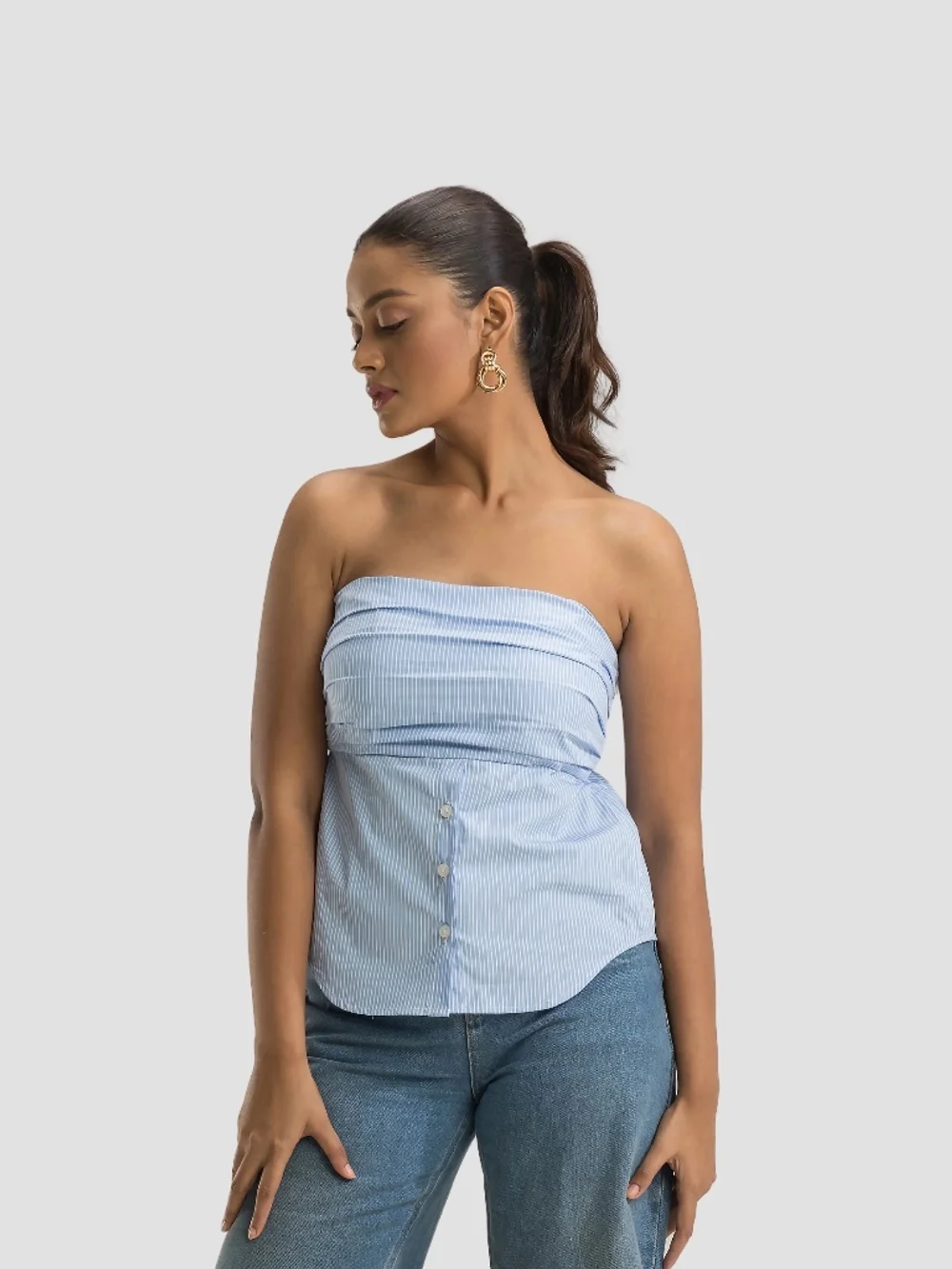 Experience the perfect blend of comfort and style with this striped strapless cotton top. Ideal for casual outings or smart-casual settings, this top features a fitted design that flatters various body types. Crafted from breathable cotton, it offers a soft, luxurious feel against your skin. Pair it with high-waisted trousers for a chic and effortless look. Perfect for summer outings, this top is a must-have for any fashion-forward woman.