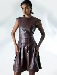 Step up your style game with this sharp brown faux-leather dress—precision tailoring and pleated flair for power moves day and night!