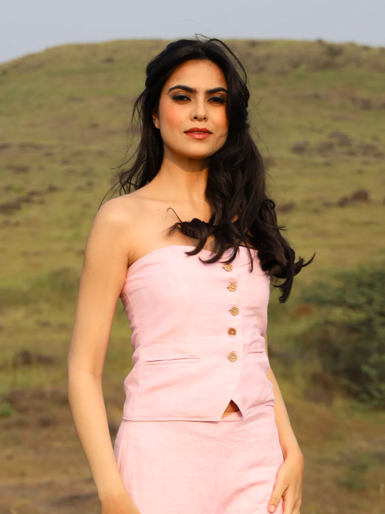 Discover the Pink Candy Top, a chic hemp crop top with wooden buttons and front pockets. Perfect for layering or wearing alone, this versatile piece is ideal fo…