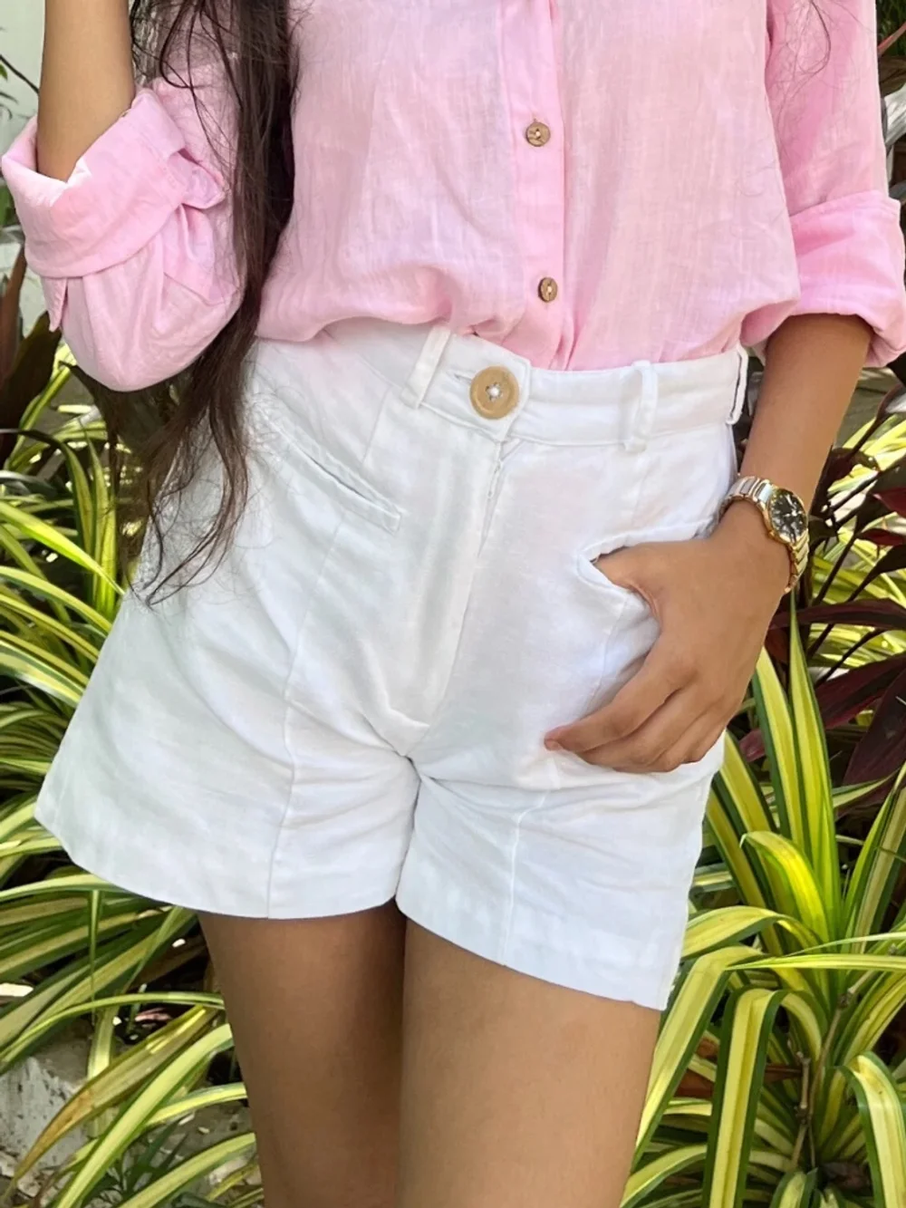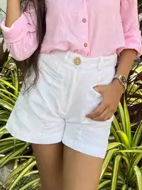 Embrace the warmth of summer with the Cindy White Shorts, a perfect blend of style and sustainability. These eco-friendly hemp and cotton shorts are crafted with four wooden button pockets, offering a versatile look for casual outings, beach vacations, or everyday wear. The mid-rise waist ensures a comfortable fit, while the breathable fabric keeps you cool in the summer heat. Ideal for those who love casual yet chic summer outfits.