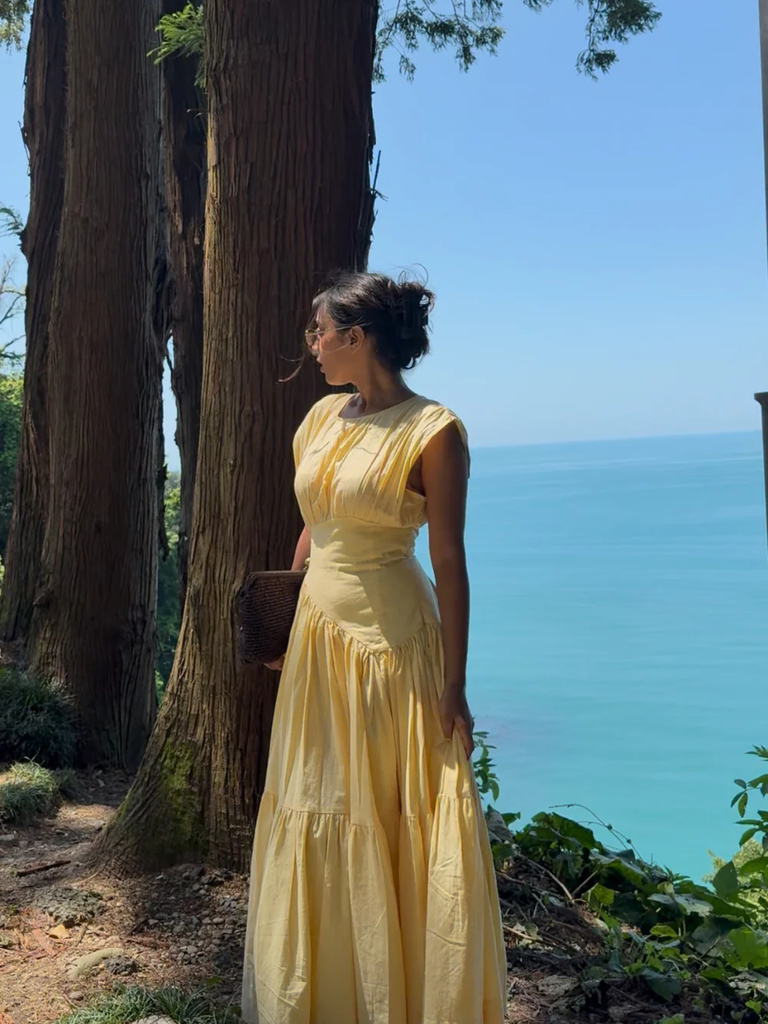 Embrace the essence of summer with this striking yellow midi dress, perfect for any occasion. Its corset-inspired waist and asymmetrical hem add a touch of scul…