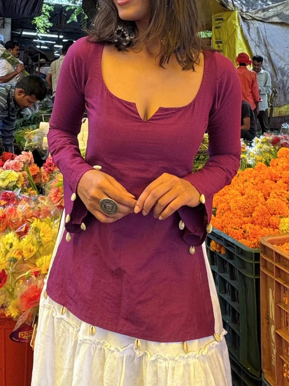 A dark lilac kurti top in a soft hemp-cotton blend, finished with shell detailing and full bell sleeves — elegant, breathable, and perfect for festive gatherings or daily wear.